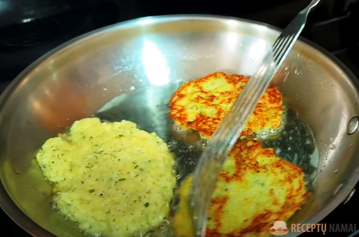 Krakmolą įmaišykite į kiaušinių ir daržovių mišinį, masę sudėkite į dubenį, kuriame liko šiek tiek krakmolo. Keptuvėje įkaitinkite augalinį aliejų, dėkite nedideles porcijas bulvių masės.