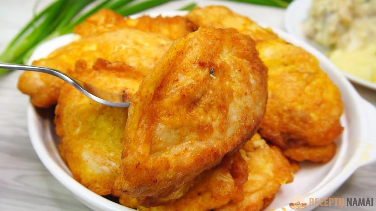Paruoškite mėsą. Kruopščiai nuplaukite vištienos krūtinėlę ir supjaustykite vidutinio dydžio porcijomis. Mėsą gerai išmuškite iš abiejų pusių.