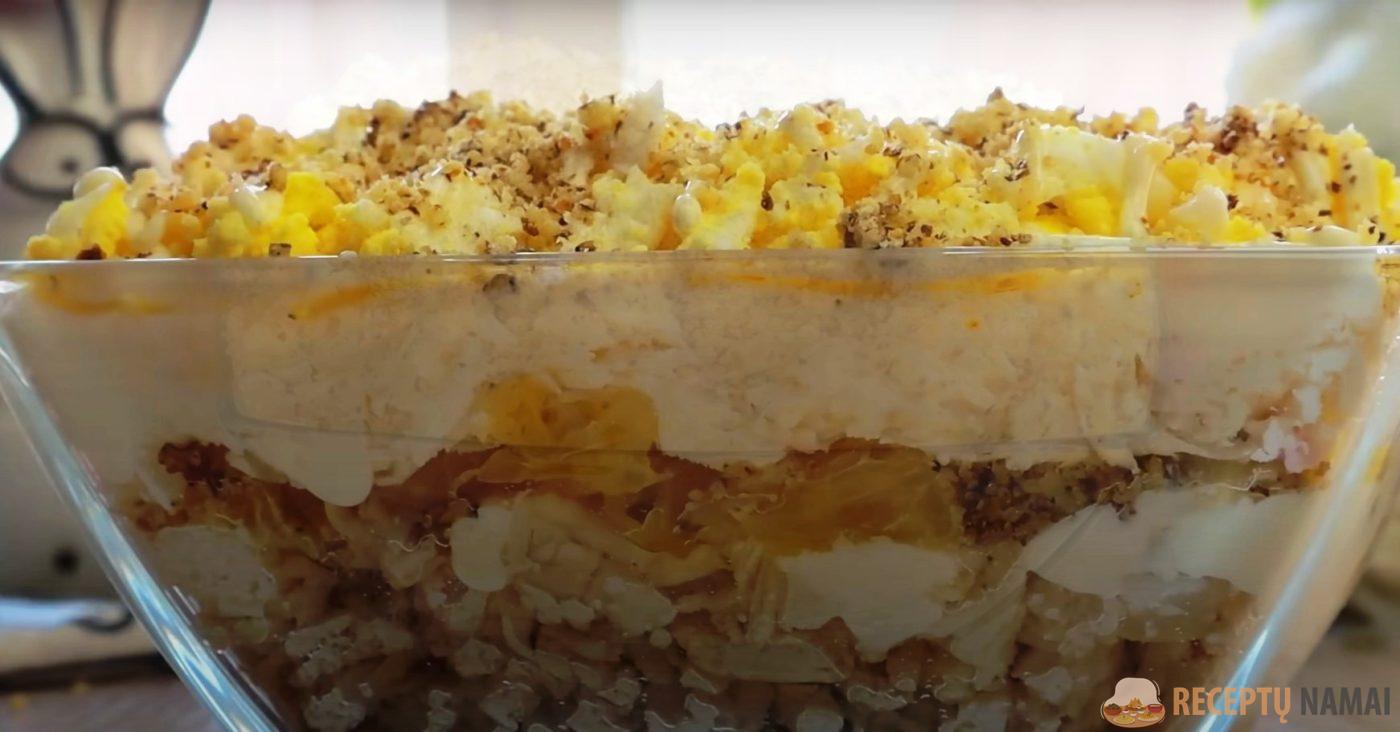 Majonezo tinklelio viršų apibarstykite smulkintais riešutais. Gausite puikias šventines salotas “Madona”.