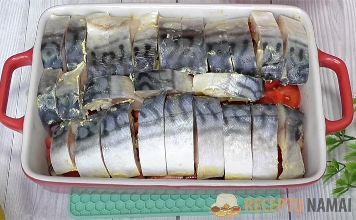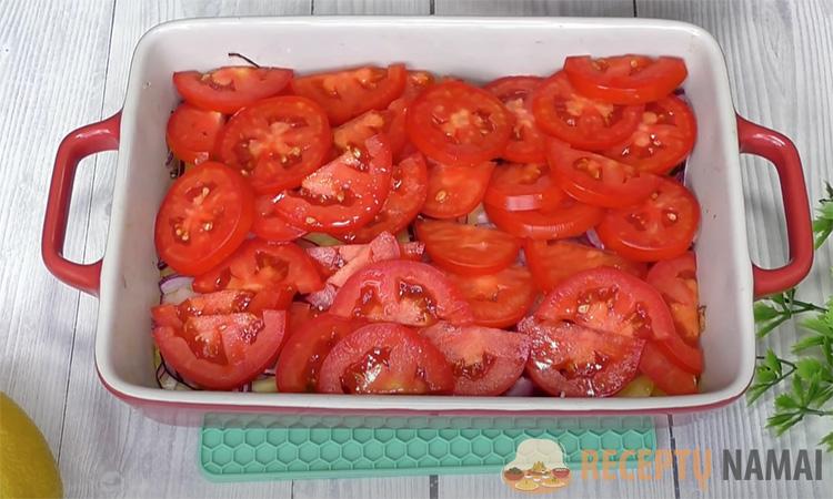 Išimkite keptuvę, nuimkite foliją ir ant viršaus uždėkite pomidorų žiedus ir žuvies gabalėlius.