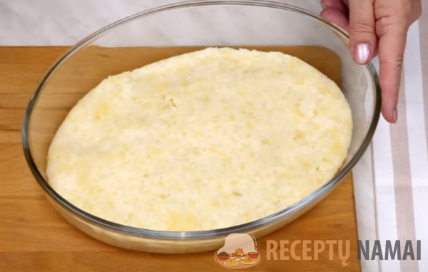 Į tą pačią vietą įpilkite šiek tiek majonezo, išmaišykite ir pirmuoju sluoksniu sudėkite į salotoms patiekti skirtą formą.