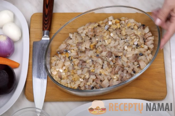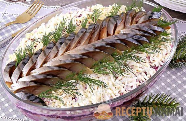 Ant viršaus dedame tolygų sluoksnį tarkuotų virtų burokėlių, paskutinis sluoksnis – smulkintų virtų kiaušinių. Belieka per vidurį paskirstyti žuvį ir salotas galima patiekti į stalą.