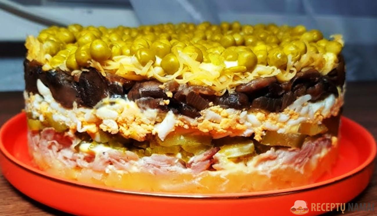 Salotos su grybais ir vištiena “Smaragdas” – vienas mėgstamiausių ir populiariausių patiekalų, kuris turi didelę paklausą ant švenčių stalų ir įprastuose namuose.