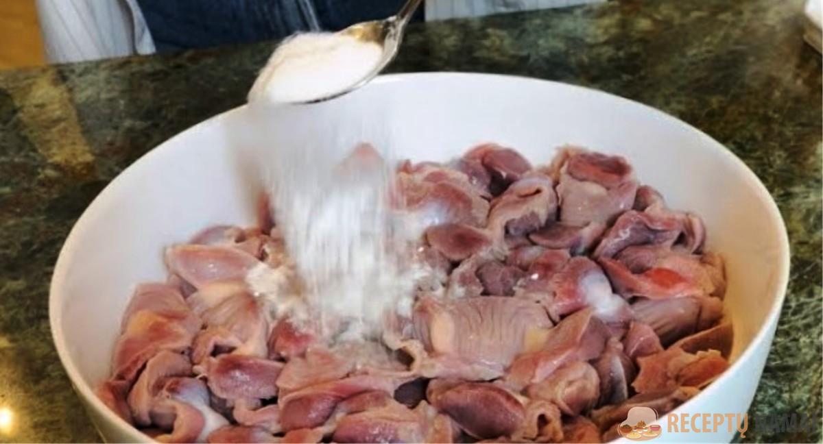 Nuplautus vištienos skrandukus užpilkite vandeniu su soda ir palikite 2 val. Tada skilvelius dar kartą nuplaukite ir virkite, kol bus paruošti.