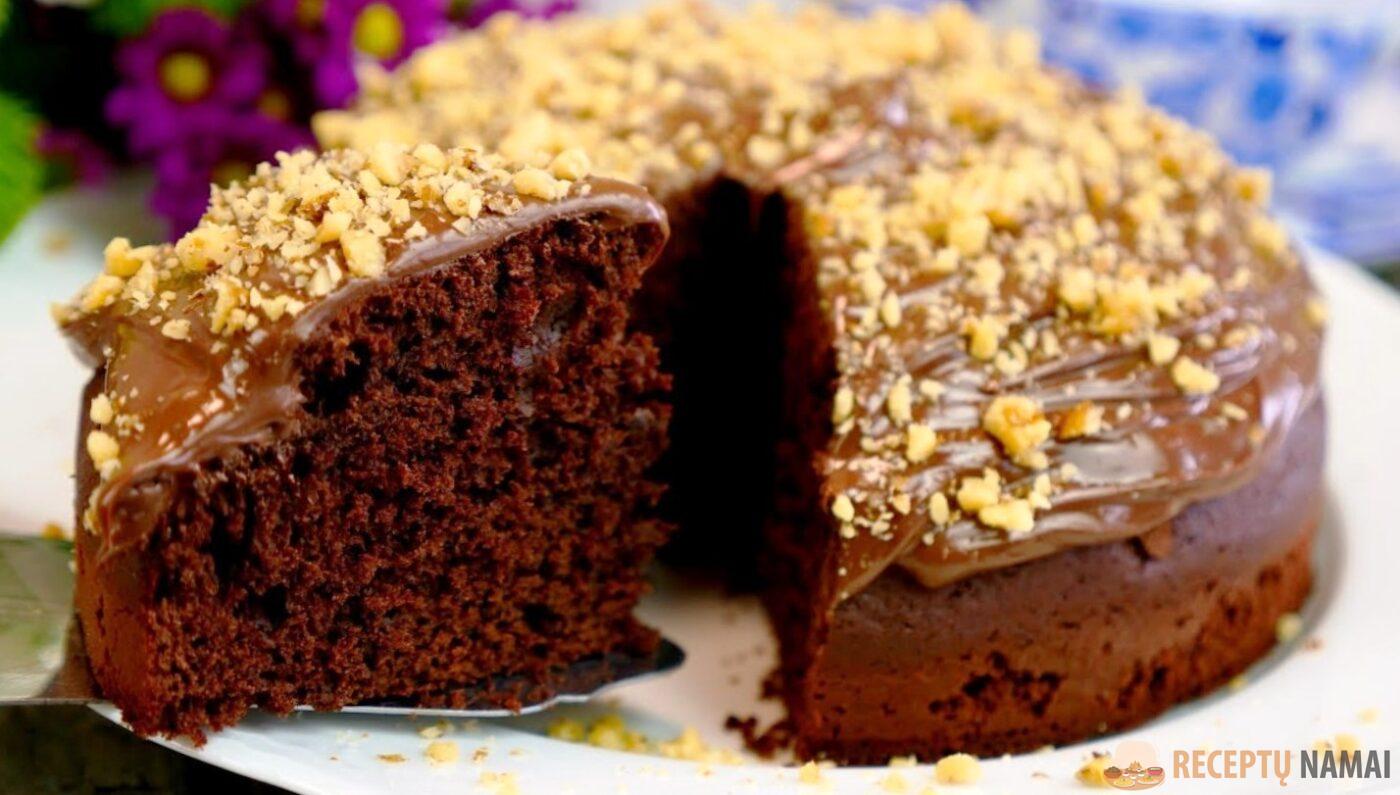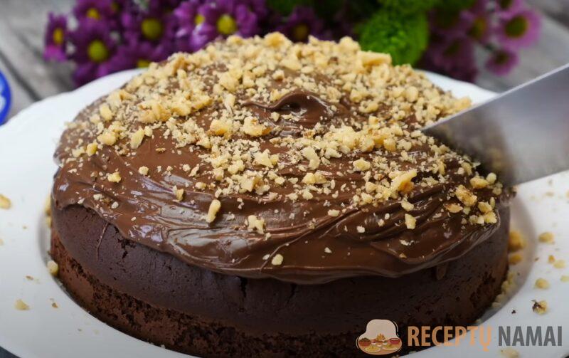 Pyragą galite aptepti bet kokia šokolado mase, glajumi, apibarstyti riešutais.