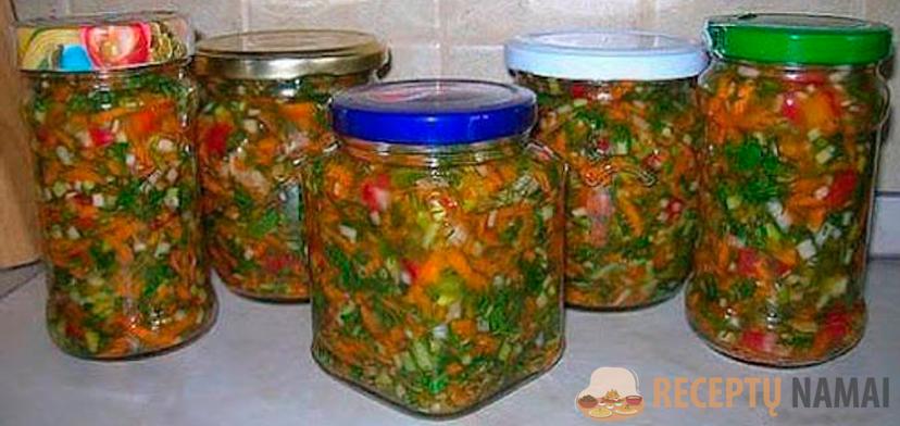 - Visas paruoštas daržoves sudėkite į dubenį, įberkite druskos ir gerai išmaišykite. Palikite dešimčiai minučių, kad druska įsigertų.