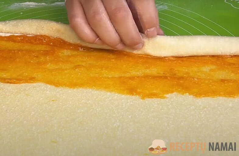 Aptepkite visą tešlos paviršių teptuku ir susukite tešlą į sluoksnį, užspausdami kraštus.