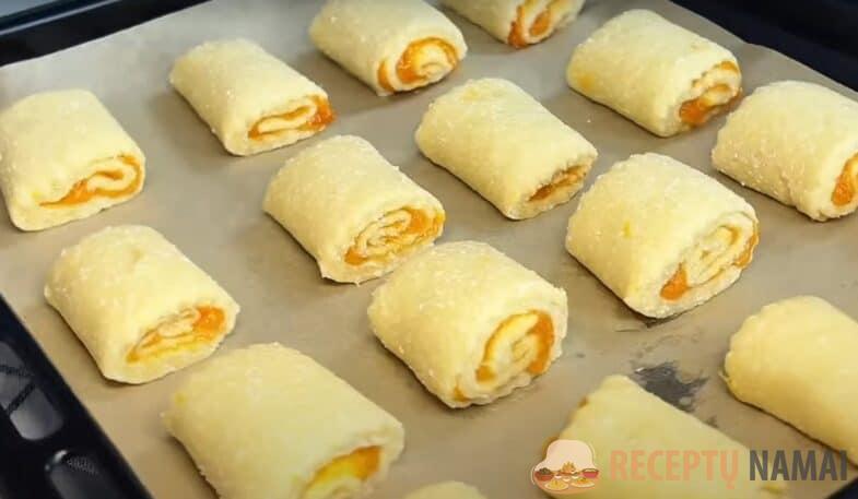 Padalykite vyniotinį į mažas porcijas ir sudėkite jas ant kepimo skardos, išklotos kepimo pergamentu.