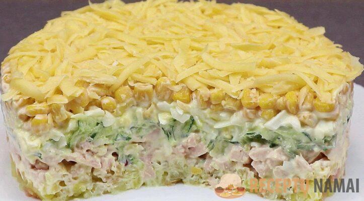 Po mirkymo nuimkite virimo žiedą ir aptepkite salotų šonus majonezu. Gausite sočias ir skanias salotas “Silkė po kailiu”.