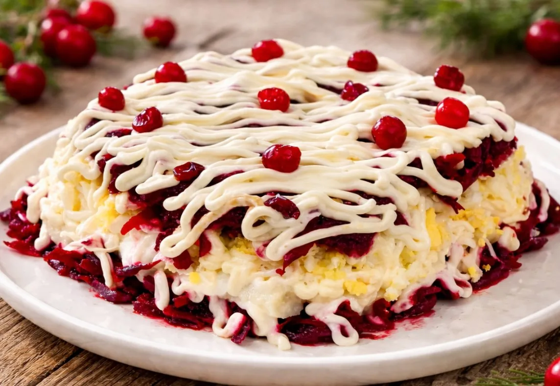 Salotas galite papuošti žalumynais ir kaliaropės uogomis arba spanguolėmis. Gaunasi įdomus salotų “Silkė po kailiu” analogas.