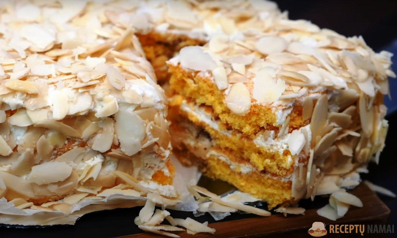 Papuoškite tortą smulkintais riešutais arba migdolų žiedlapiais. Norvegiškas pyragas yra skanus ir įdomus.