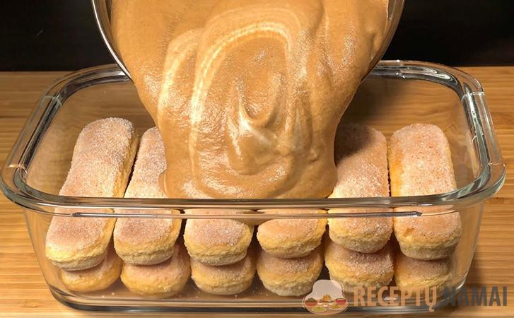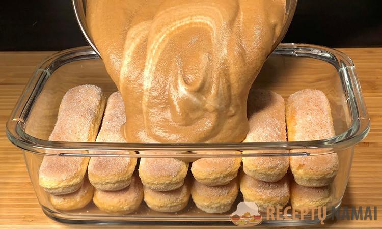 Dabar sumaišykite kavos ir grietinėlės mišinį ir atsargiai išmaišykite mentele. Sausainius pamerkite į pieną ir sudėkite į kepimo formą. Kiekvieną sluoksnį aptepkite kremu ir kartokite, kol baigsis ingredientai. Desertas paruoštas.