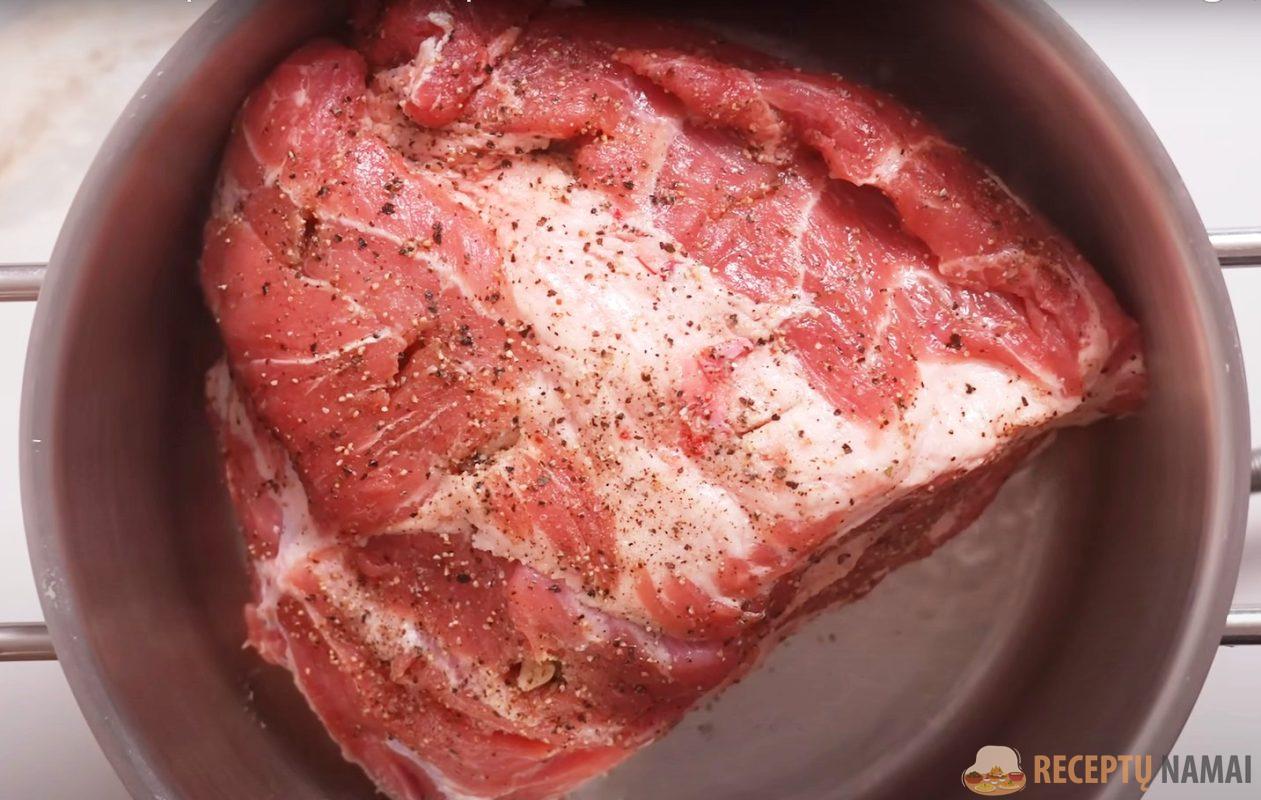 Į mėsą įtrinkite likusią druską ir pipirus ir palikite marinuotis kelioms valandoms. Keptuvėje įkaitiname augalinį aliejų, apkepiname mėsą iš visų pusių iki auksinės spalvos.