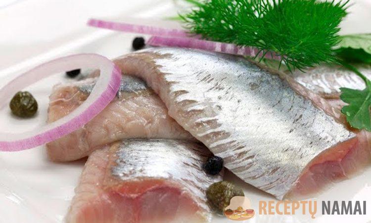 Silkę supjaustome, išimame vidų ir dedame į indą, tada pilnai užpilame marinatu.