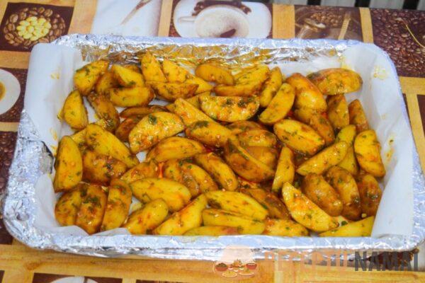 Maisto gaminimui imsime paprasčiausius produktus. 4 vištienos šlauneles, keturias dideles bulves, morkas, tris pomidorus ir paprikas. Be to, sudėkite pipirų grūdelius, porą česnako skiltelių, lauro lapą, krapus ir petražoles. Vištienos šlauneles (be odos ir kaulų) sudėkite į gilų dubenį, suberkite žoleles, maltus juoduosius pipirus ir druską.