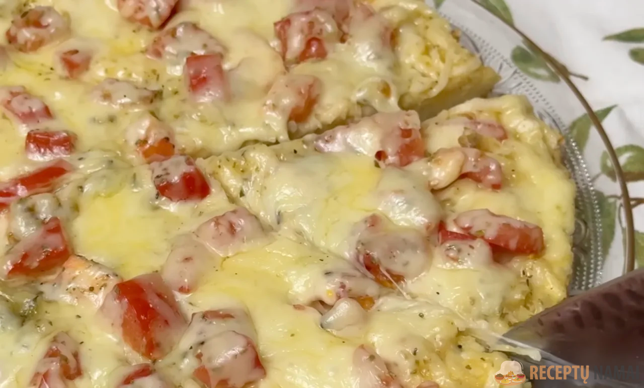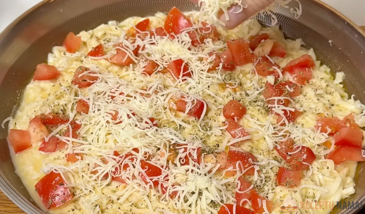 Pita duoną supjaustykite plonomis juostelėmis. Išplakite tris kiaušinius, įpilkite pieno, druskos, pipirų ir užpilkite ant pitos duonos. Išmaišykite. Kepimo skardą patepkite aliejumi. Sudėkite pitą į kepimo skardą ir tolygiai paskleiskite. Pomidorą supjaustykite kubeliais ir sudėkite ant pitos duonos. Pabarstykite prieskoniais. Taip pat užtepkite ant pitos duonos.