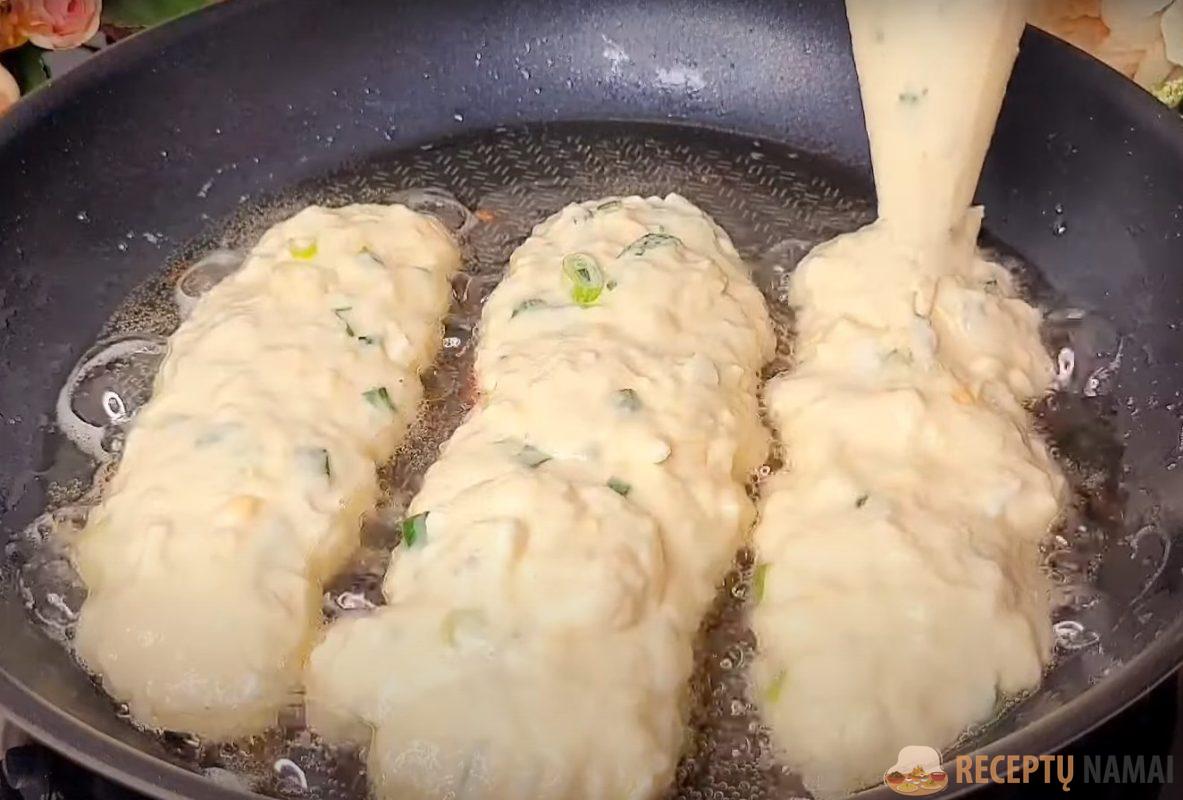 konditerinį maišelį, keptuvėje įkaitiname augalinį aliejų. Tešlą sukrėskite į keptuvę, kepkite paplotėlius iš abiejų pusių, kol paruduos.