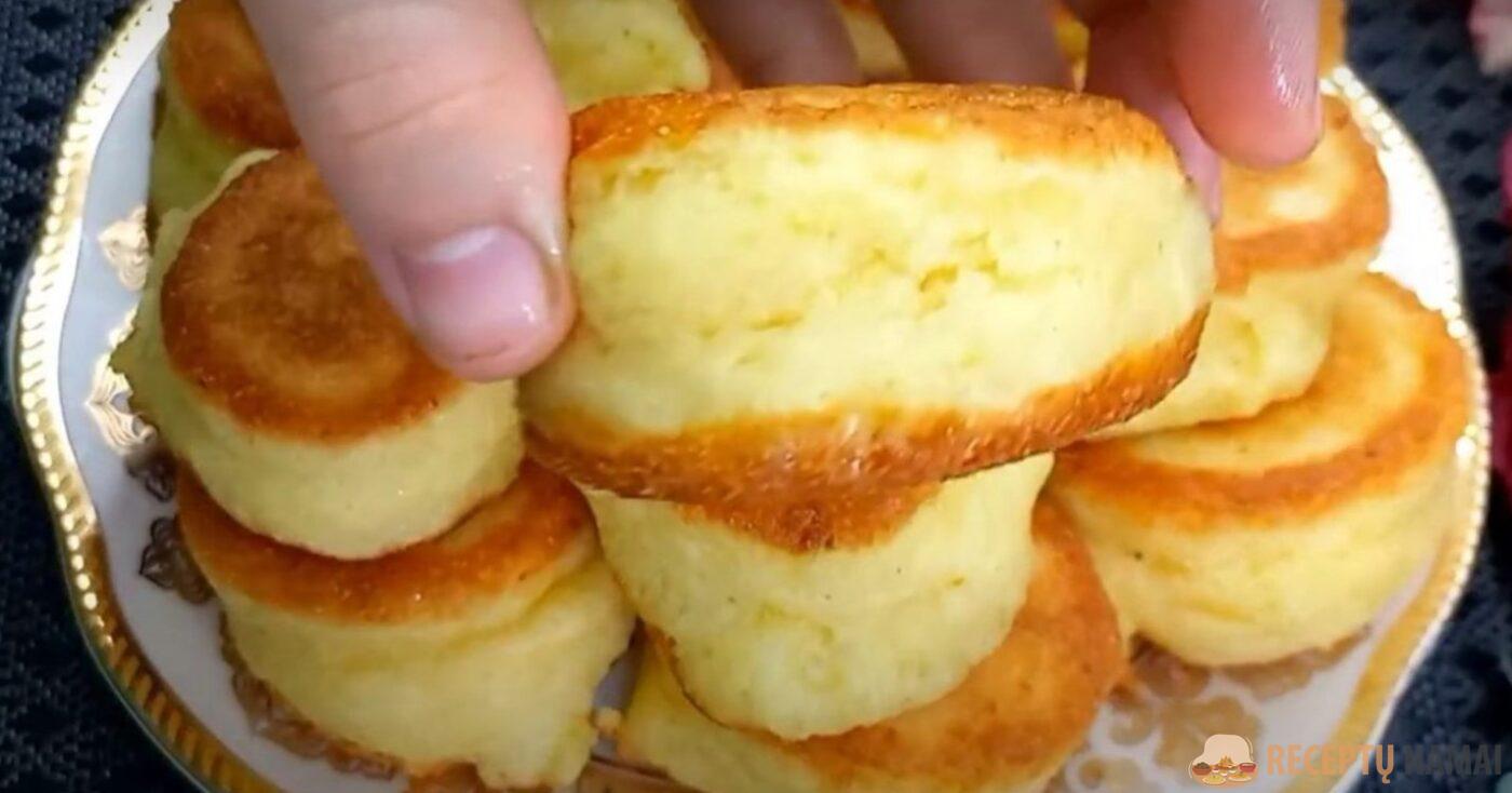 Kiaušinius dubenyje išplakame su pora šaukštų cukraus pudros, vaniliniu cukrumi ir druska. Į mišinį supilti kefyrą, pabarstyti soda ir išmaišyti. Į gautą masę sudėkite varškę, ištirpinkite ją kiaušinių mišinyje