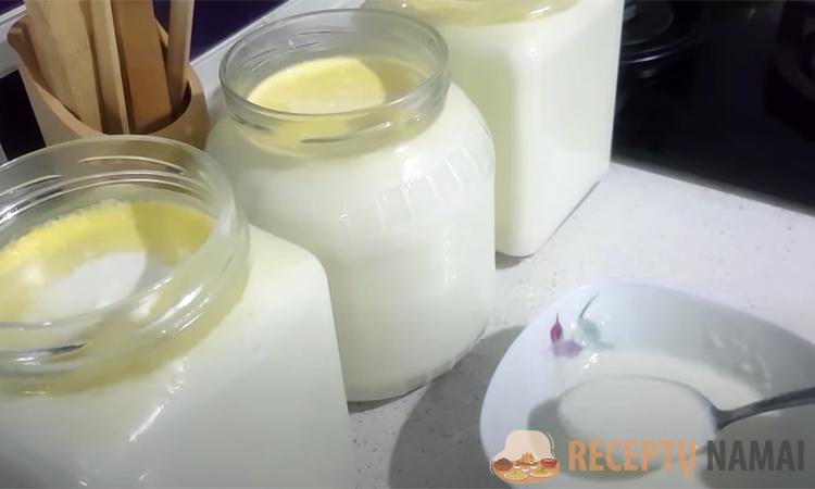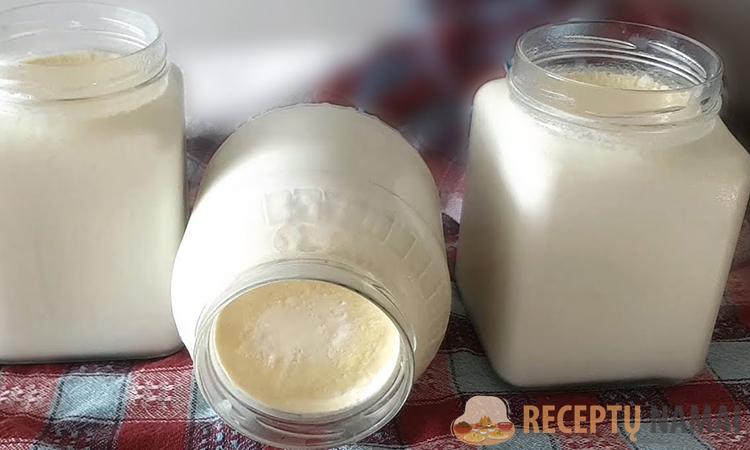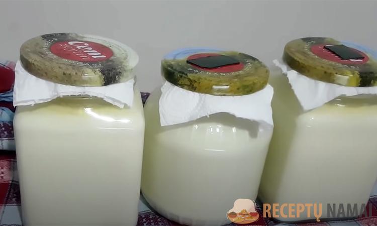 . Pereikime prie proceso, jis gana paprastas. Pieną supilame į puodą, uždedame viryklę ir užverdame. Palaikome 15 minučių, tada nuimame ir supilstome į stiklainius. Tolesniam darbui pieno temperatūra stiklainiuose turi būti 45 laipsniai. Geriau naudoti paprasčiausią virtuvinį termometrą, tokie parduodami daugelyje kulinarijos parduotuvių ir retai kainuoja daugiau nei 300 rublių.