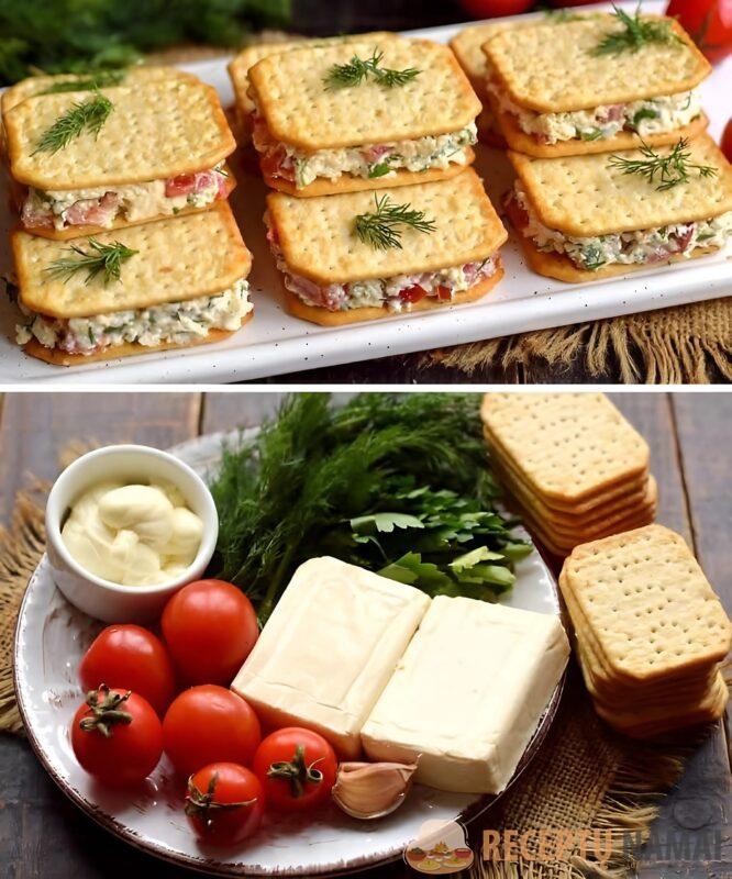 Užkandį geriau patiekti iš karto ant stalo, kad krekeris nesuminkštėtų. Kaip matote, tai nepaprastai skanu ir paprasta!