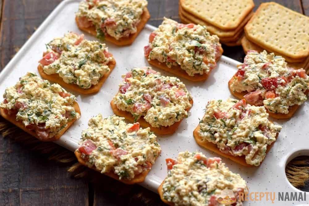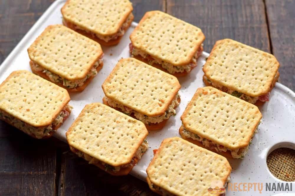 Užkandį geriau patiekti iš karto ant stalo, kad krekeris nesuminkštėtų. Kaip matote, tai nepaprastai skanu ir paprasta!