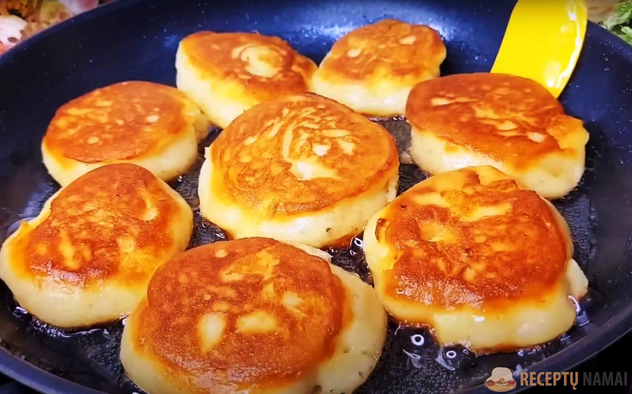 Tešlą sudėkite į konditerinį maišelį. Keptuvėje įkaitinkite augalinį aliejų, dekite į jį porcijas paplotėlių.