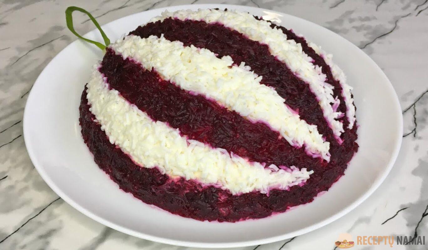 Ant salotų pažymėkite juosteles ir išdėliokite burokėlius, o tarp burokėlių juostelių išdėliokite baltymus, sutarkuotus smulkia tarka