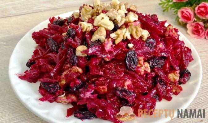Be originalaus dizaino, salotos pasižymi dar vienu ypatumu – puikiai suderintais produktais. Jums reikės labai nedaug komponentų – vištienos, burokėlių, džiovintų slyvų, sūrio. Gaunasi labai skanu.