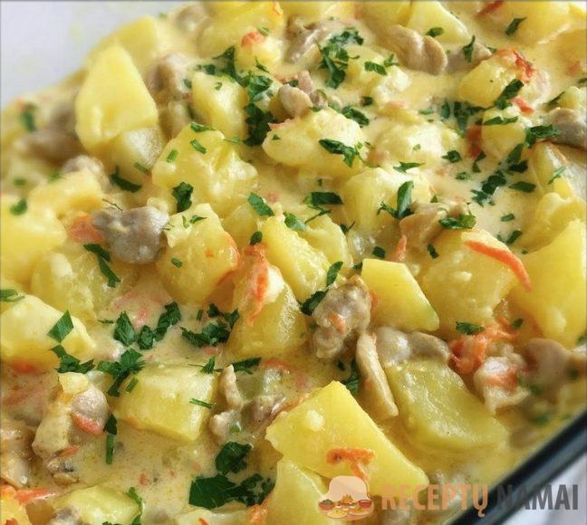 - Išvirtas bulves sudėkite į gilią kepimo skardą.