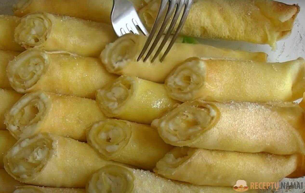 Keptuvėje kepkite plonus blynelius. Sumaišykite visus varškės produktus, supilkite juos į blynelius ir susukite juos į ritinėlį arba vokelį.
