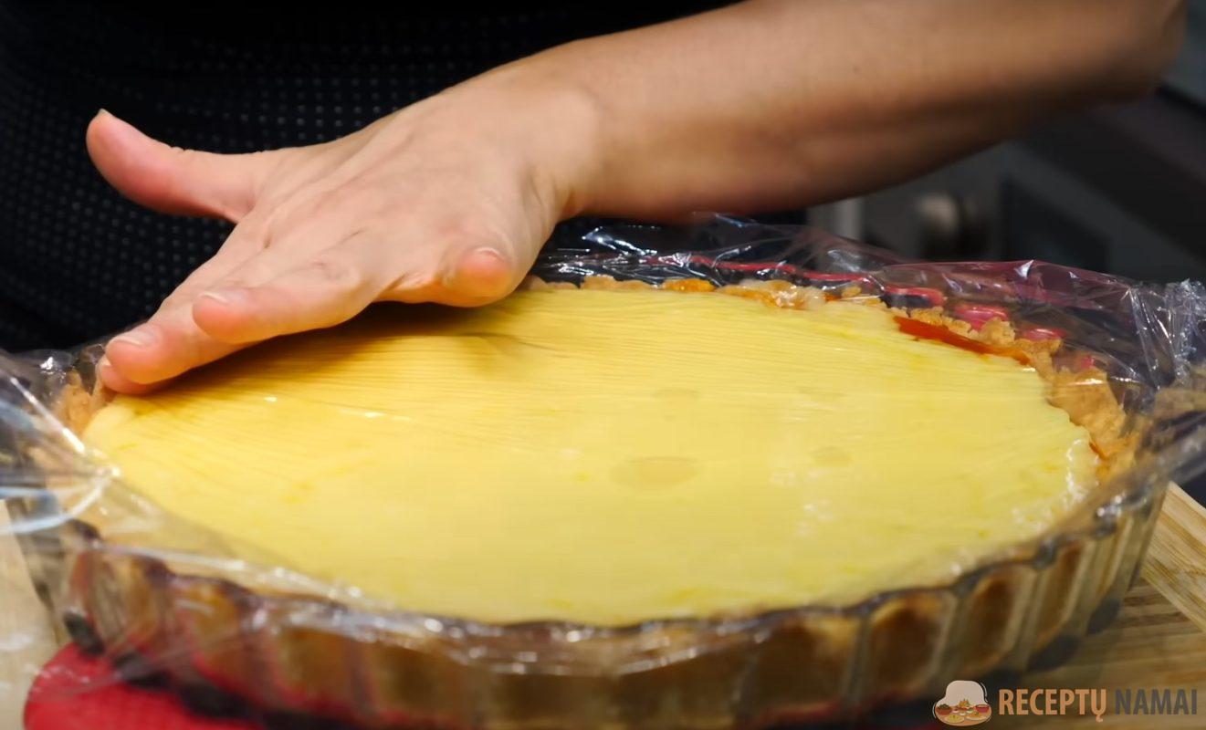 Tada sudėkite kremo pagrindą į atskirą dubenį, uždenkite maistine plėvele ir palikite atvėsti. Tortą ištepkite džemu, sudėkite atvėsusį kremą.