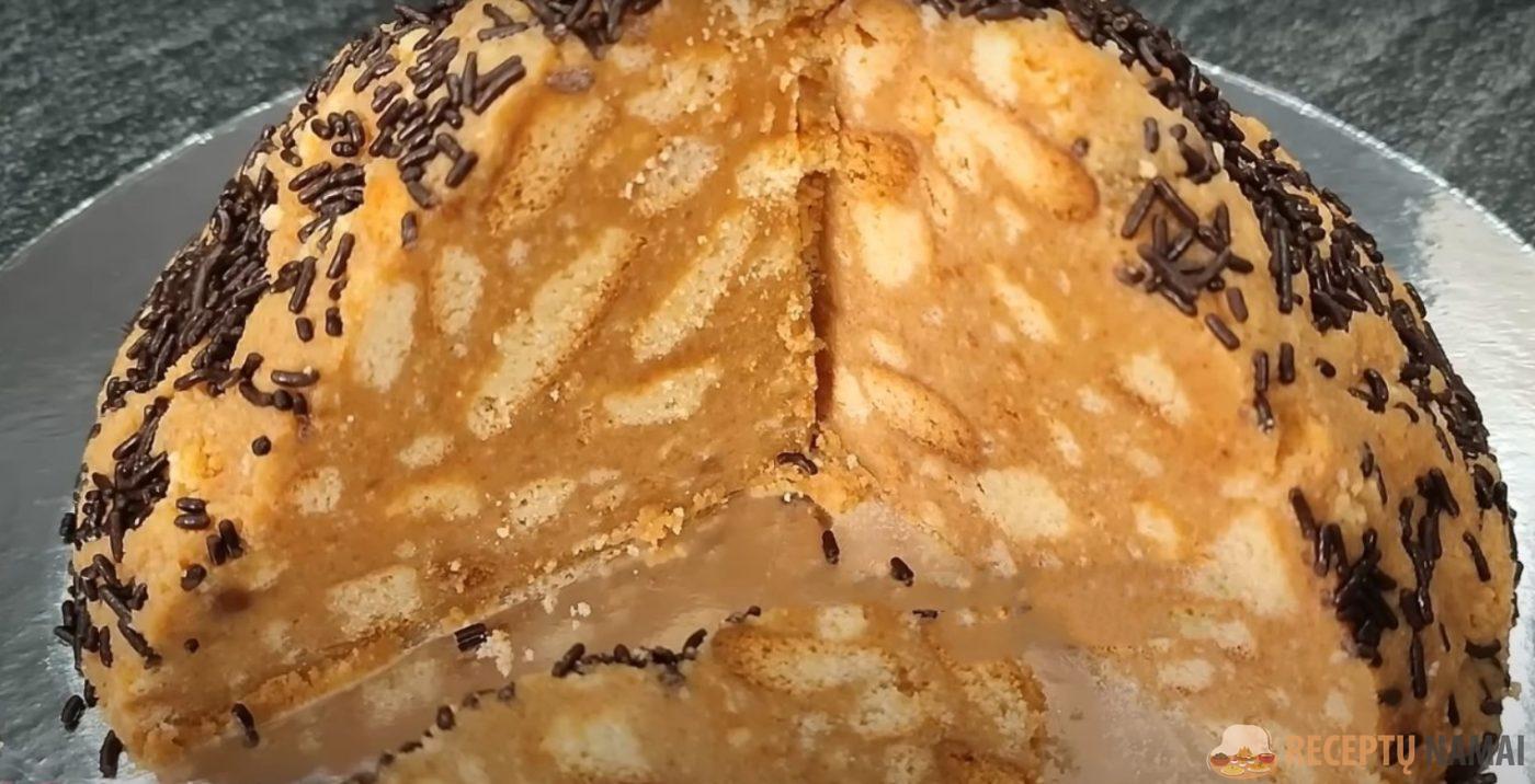 . Palikite sausainius atvėsti ir tada sulaužykite juos į mažus gabalėlius. Kremui minkštą sviestą plaktuvu sumaišykite su virintu sutirštintu pienu