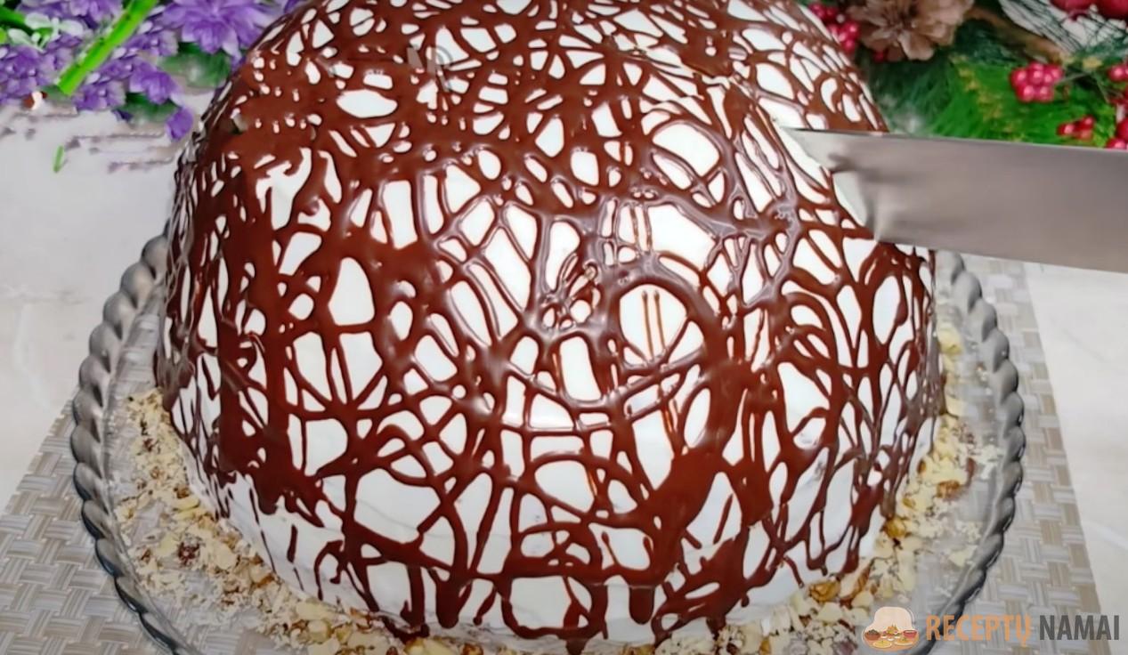 Paruoštą tortą galima aplieti šokoladiniu glajumi arba papuošti vaisiais. Gaunasi gana paprastas, šventinis tortas.