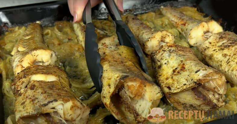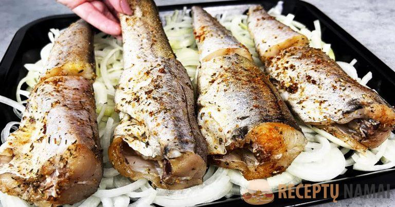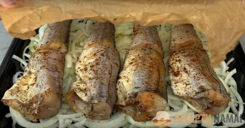 Kepimo formą ištepkite aliejumi. Išdėliokite pusžiedžiais supjaustytą svogūną. Ant jo sudėkite žuvį. Uždenkite pergamentu. Kepkite 200 laipsnių temperatūroje 30-35 minutes. Likus 5 minutėms iki kepimo pradžios nuimkite pergamentą. Patiekalas paruoštas ragauti