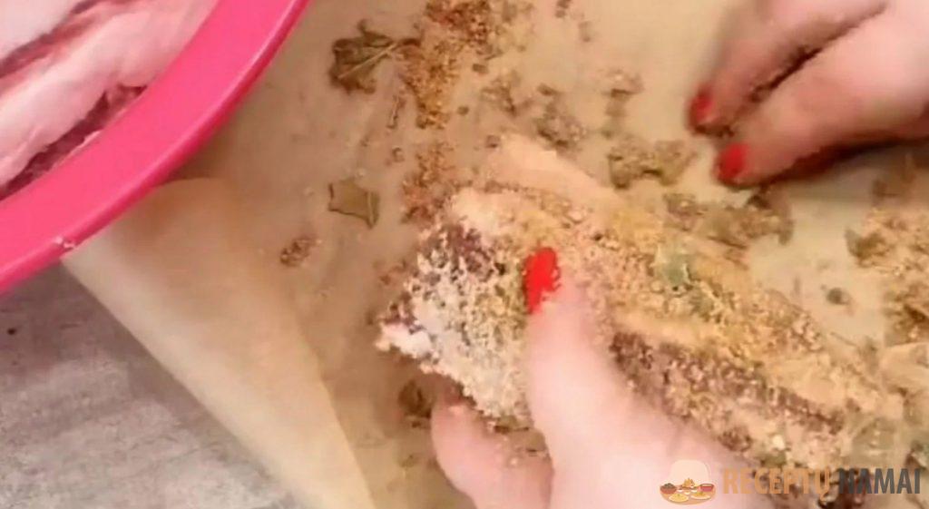 Dabar kiekvieną lašinių gabalėlį apibarstome šiuo druskos mišiniu ir suvyniojame į pergamentinį popierių.