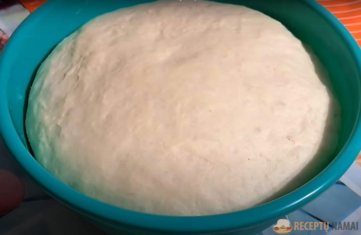 . Į mišinį dalimis suberkite miltus ir išminkykite minkštą ir šiek tiek lipnią tešlą. Palikite tešlą 1 valandai karštyje, kad padidėtų