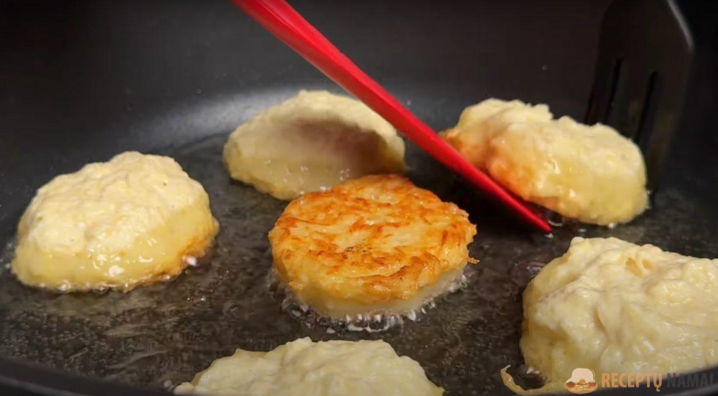 Keptuvėje įkaitinkite augalinį aliejų, į jį dėkite nedideles porcijas paplotėlių. Vienu šaukštu semkite tešlą, o kitu šaukštu perkelkite ją į keptuvę.