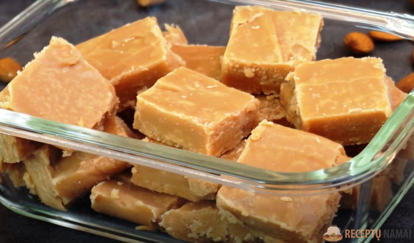 spalva pasikeis į karamelinę, sudėkite į ją sviestą ir išmaišykite. Masę supilkite į maistine plėvele uždengtą formą ir palikite sustingti.