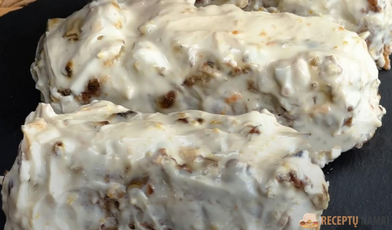 Peiliu susmulkinkite graikinius riešutus ir supilkite juos ant masės, riešutų sluoksnį užpilkite medumi. Desertą kepkite 180 laipsnių temperatūroje 40 minučių.