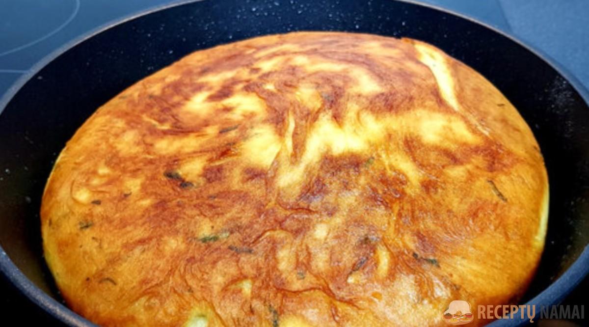 Įdarytą tešlą lengvai išminkykite rankomis. Įkaitinkite augalinį aliejų 26 cm keptuvėje. Dėkite pyragą ant paviršiaus, kepkite pusvalandį po dangčiu ant vidutinės ugnies.