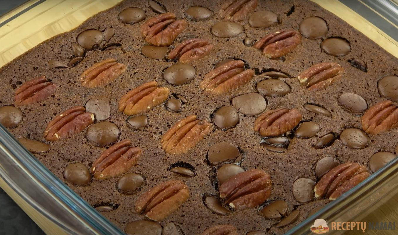 į masę, išmaišykite. Ant masės užbarstykite šokolado griežinėlių ir graikinių riešutų. Kepkite biskvitą 180 laipsnių temperatūroje 35-40 minučių.