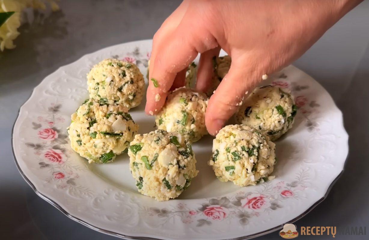 Tuo metu šakute išminkykite nuluptus kiaušinius ir sudėkite smulkintus žaliuosius svogūnus