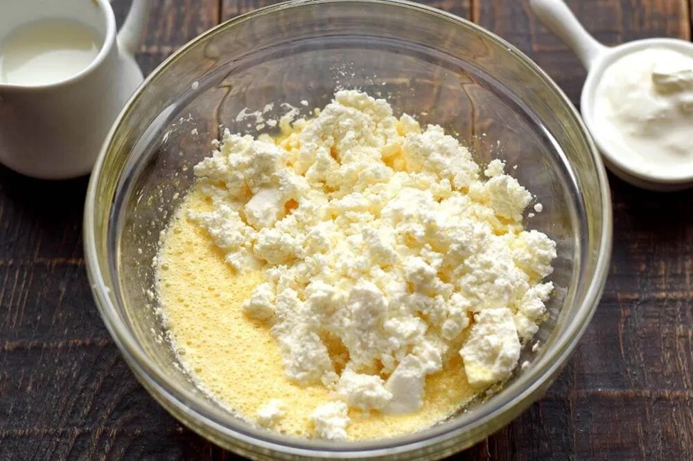 Įdėkite vidutinio riebumo varškės sūrį. Supilkite kambario temperatūros pieną. Viską išplakite iki vientisos masės (be sūrio grūdelių).