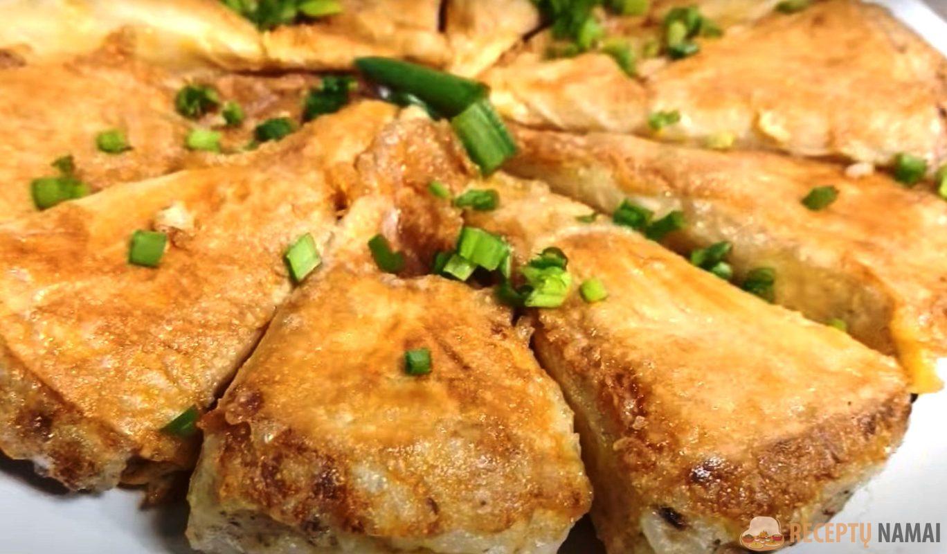 Iškepusį patiekalą galima papuošti smulkintais žaliaisiais svogūnais. Gaunasi paprastas biudžetinis patiekalas.