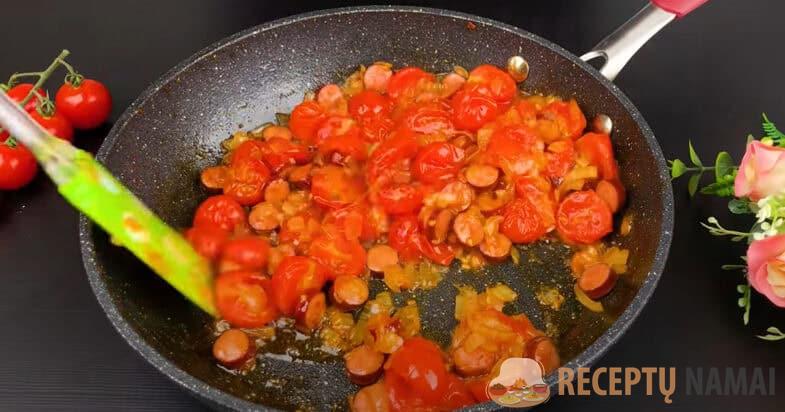 Kepimui įkaitintame aliejuje pirmiausia pakepinamas smulkiai supjaustytas svogūnas. Kai jie apskrunda, sudedamos supjaustytos medžioklinės dešrelės ir dar kelias minutes palaikoma ant ugnies. Vyšninius pomidorus perpjaukite pusiau ir pasiųskite prie likusių ingredientų. Česnakas smulkiai sutarkuojamas ir taip pat įmaišomas į mišinį, taip išgaunant ryškų ir sodrų skonį.