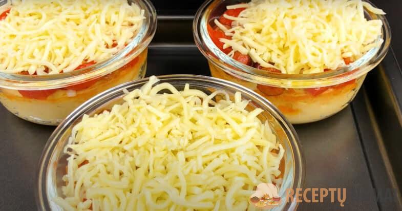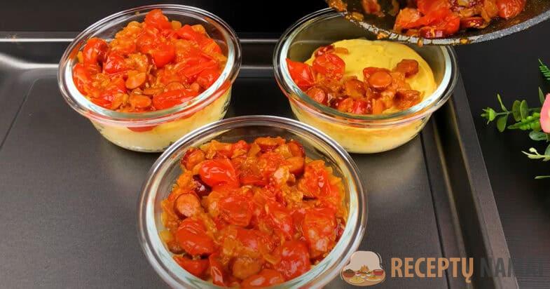 Kepimo forma ištepama augaliniu aliejumi ir ant jos dugno sudedama bulvių masė, ją išlyginant. Ant jos dedamos karštos keptos dešrelės ir pomidorai. Paskutinis sluoksnis bus sūris, sutarkuotas vidutine tarka.