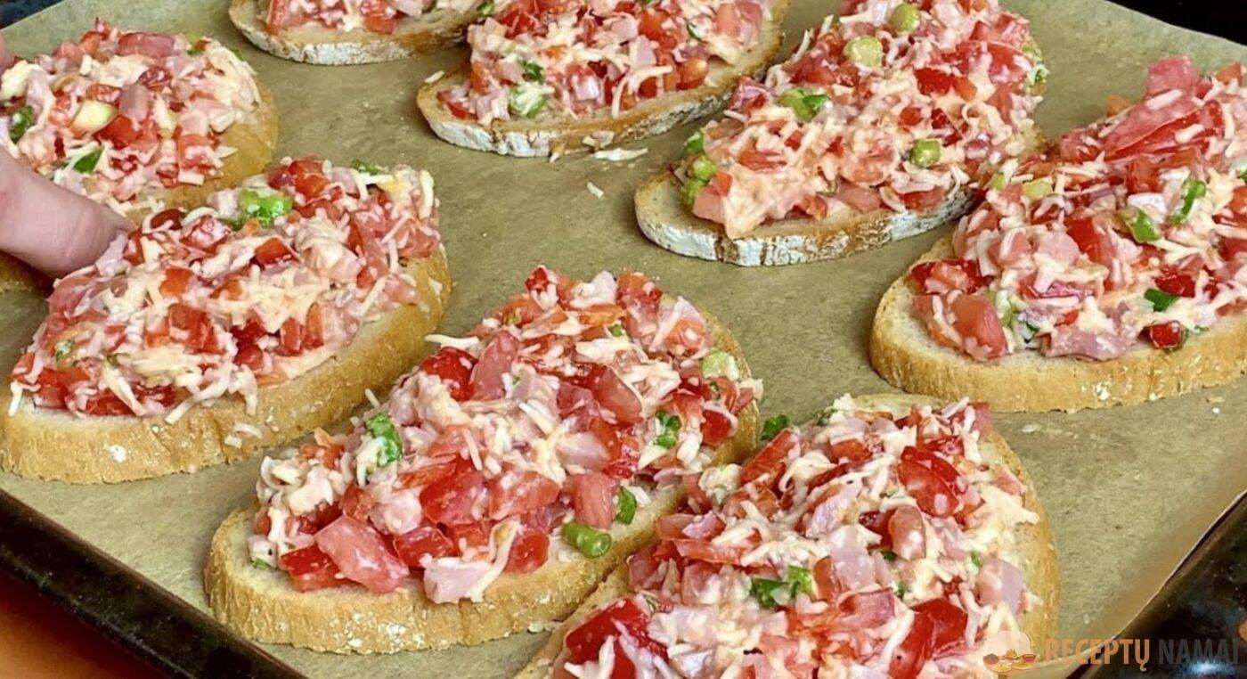 Nuluptą saldžiąją papriką ir pomidorą supjaustykite mažais kubeliais, sumaišykite viename dubenyje. Kepimo skardą išklokite pergamentu, ant jos paviršiaus išdėliokite duonos riekeles.