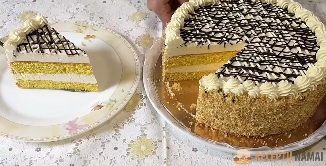 Kepkite 180 laipsnių temperatūroje, kol bus paruoštas. Atvėsinkite. Supjaustykite į 3 pyragėlius