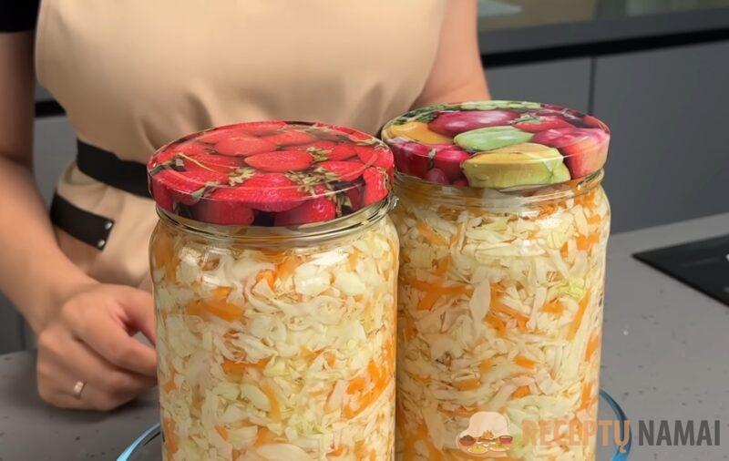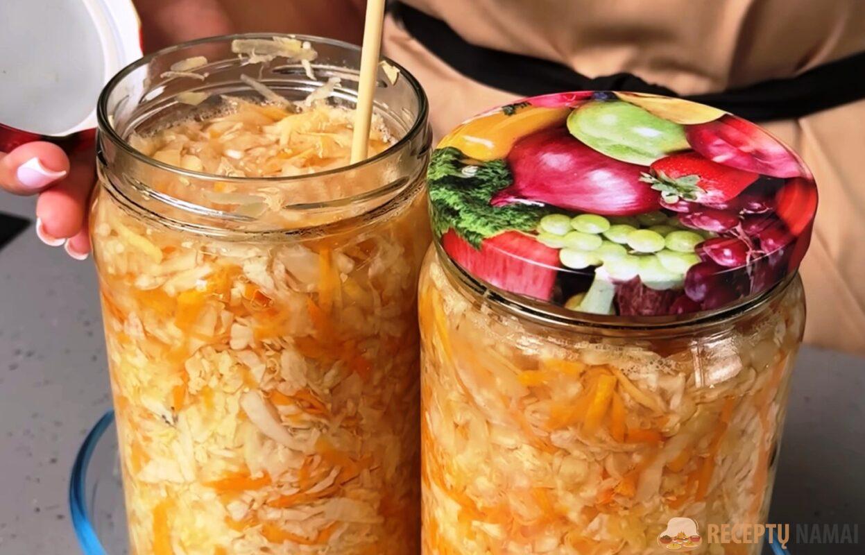 Tada stiklainius uždarykite dangteliais ir kopūstus padėkite į šaldytuvą.