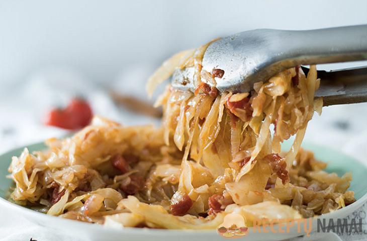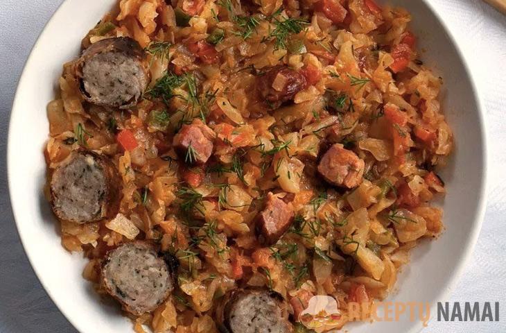 Kai kopūstai išskiria skystį, įpilkite vandens ir troškinkite ant silpnos ugnies, kol suminkštės. Įdėkite juodųjų pipirų, pomidorų pastos, pjaustytų dešrelių, rūkyto kumpio ir krapų ir virkite dar 5 minutes. Patiekite karštus.